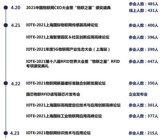 專業(yè)的高峰論壇,將會聚焦一個垂直細(xì)分話題的代表企業(yè)與行業(yè)觀眾群體,更好的促進(jìn)行業(yè)的交流。2021年IOTE 2021第十四屆國際物聯(lián)網(wǎng)展·上海站舉辦十場不同主題的高峰論壇,上百位演講嘉賓圍繞RFID、傳感器、定位、5G、物聯(lián)網(wǎng)、云平臺、智慧園區(qū)/社區(qū)、工業(yè)等領(lǐng)域,講市場現(xiàn)狀及未來趨勢,以及最新產(chǎn)品應(yīng)用到市場的化學(xué)反應(yīng)! 而IOTE 2022 第十七屆國際物聯(lián)網(wǎng)站·上海站,也將圍繞物聯(lián)網(wǎng)不同領(lǐng)域,舉辦10場+高峰論壇,請敬請期待!