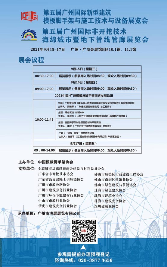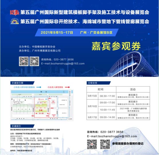 由中國模板腳手架協(xié)會主辦,廣州市博展展覽有限公司承辦的第五屆廣州國際新型建筑模板腳手架及施工技術(shù)與設(shè)備展覽會(以下簡稱廣州模架展)將于9月15-17日在廣州廣交會展館B區(qū)舉行。同期舉行第五屆廣州國際非開挖技術(shù)海綿城市暨地下管線管廊展覽會。