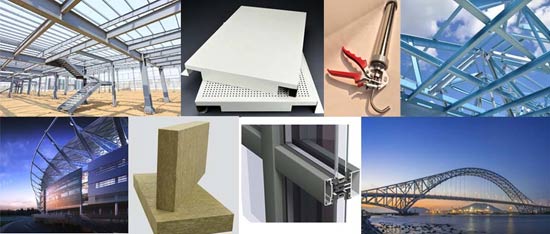 6. 建筑表皮與屋面:彩鋼板、搪瓷鋼板、鋁鎂錳板、鍍鋅板、烤瓷鋁板、氟碳鋁板、蜂窩鋁板、不銹鋼薄板、鋁(銅)及金屬?gòu)?fù)合板材、鍍鈦板、彩色涂層板等板材及屋面材料與配套設(shè)備等;