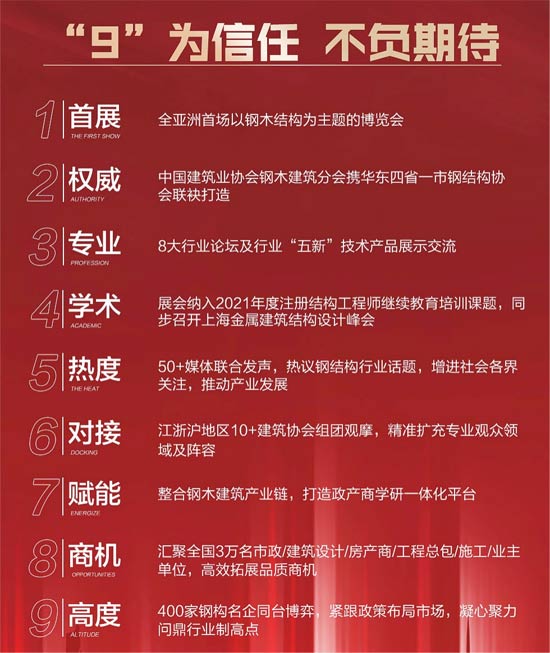 為了促進(jìn)鋼木建筑產(chǎn)業(yè)綠色發(fā)展,推進(jìn)智能制造與新型建筑工業(yè)化深度融合,實(shí)現(xiàn)建筑業(yè)高質(zhì)量發(fā)展要求,抓住鋼木結(jié)構(gòu)建筑推廣的市場(chǎng)機(jī)遇,發(fā)揮鋼木結(jié)構(gòu)在裝配式建筑中的示范、引領(lǐng)作用,由中國(guó)建筑業(yè)協(xié)會(huì)鋼木建筑分會(huì)和上海市勘察設(shè)計(jì)行業(yè)協(xié)會(huì)主辦,上海市金屬結(jié)構(gòu)行業(yè)協(xié)會(huì)協(xié)辦,上海展業(yè)展覽有限公司承辦的“2021亞洲金屬建筑設(shè)計(jì)與產(chǎn)業(yè)博覽會(huì)(MBE)”將以設(shè)計(jì)為綱,材料系統(tǒng)為領(lǐng)的辦會(huì)方向,全力打造亞洲金屬建筑產(chǎn)業(yè)一站式解決方案平臺(tái)。同期還將舉辦多場(chǎng)行業(yè)高質(zhì)量論壇和技術(shù)研討會(huì)議,吸引亞太多個(gè)國(guó)家及地區(qū)的市政單位、設(shè)計(jì)研究院、建筑設(shè)計(jì)/咨詢公司、投資商/開(kāi)發(fā)商/業(yè)主、工程建設(shè)/施工單位、建筑協(xié)會(huì)/學(xué)會(huì)、經(jīng)銷(xiāo)代理商和鋼木建筑裝備與材料行業(yè)的專(zhuān)業(yè)人士到場(chǎng)參會(huì)參展,探討行業(yè)最新政策導(dǎo)向、科研成果和實(shí)踐經(jīng)驗(yàn),共促鋼木建筑產(chǎn)業(yè)發(fā)展!