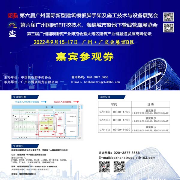 由中國模板腳手架協(xié)會主辦,廣州市博展展覽有限公司承辦的“第六屆廣州國際新型建筑模板腳手架及施工技術(shù)與設(shè)備展覽會、第六屆廣州國際海綿城市暨地下管線管廊規(guī)劃與建設(shè)展覽會、第三屆廣州國際建筑產(chǎn)業(yè)博覽會”(下文簡稱“本屆展會”),將于2022年9月15-17日在廣州廣交會展館B區(qū)9.1-11.1館隆重舉行。