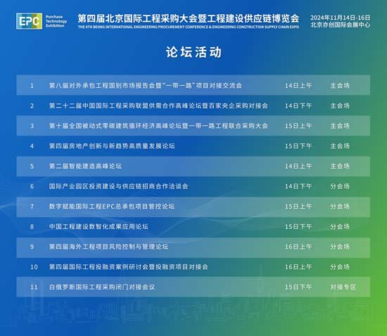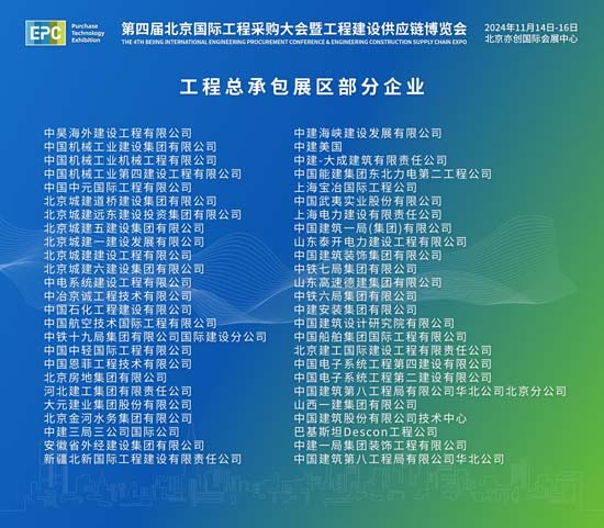 EPC2024將于2024年11月14-16日在北京.北人亦創(chuàng)國(guó)際會(huì)展中心舉辦,本屆展會(huì)以“綠色低碳、高效融合”為主題。展覽涉及綠色建筑材料與裝飾材料、電梯、綠色電力能源、管材管件、防水材料、工程施工機(jī)械設(shè)備、裝配式建筑與集成房屋、模板及腳手架、工程物流、EPC工程總承包、設(shè)計(jì)咨詢、專業(yè)承/分包、采購(gòu)與供應(yīng)鏈平臺(tái)、供應(yīng)鏈金融服務(wù)、建筑木材與木制品、石材、鋼材鋼筋等,涵蓋工程產(chǎn)業(yè)鏈全鏈。