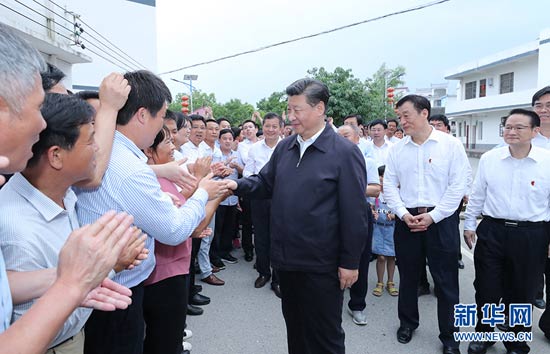 5月20日至22日,中共中央總書(shū)記、國(guó)家主席、中央軍委主席習(xí)近平在江西考察,主持召開(kāi)推動(dòng)中部地區(qū)崛起工作座談會(huì)并發(fā)表重要講話。這是習(xí)近平在贛州市于都縣梓山鎮(zhèn)潭頭村看望當(dāng)?shù)厝罕?,同鄉(xiāng)親們親切握手。 新華社記者 鞠鵬 攝