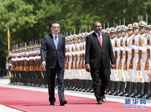 5月27日,國(guó)務(wù)院總理李克強(qiáng)在北京人民大會(huì)堂同瓦努阿圖總理薩爾維舉行會(huì)談。這是會(huì)談前,李克強(qiáng)在人民大會(huì)堂東門(mén)外廣場(chǎng)為薩爾維舉行歡迎儀式。 新華社記者 丁海濤 攝