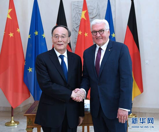 應(yīng)德國(guó)聯(lián)邦政府邀請(qǐng),國(guó)家副主席王岐山當(dāng)?shù)貢r(shí)間5月30日至6月2日訪問(wèn)德國(guó)。這是5月31日,王岐山在柏林會(huì)見(jiàn)德國(guó)總統(tǒng)施泰因邁爾。 新華社記者 饒愛(ài)民 攝