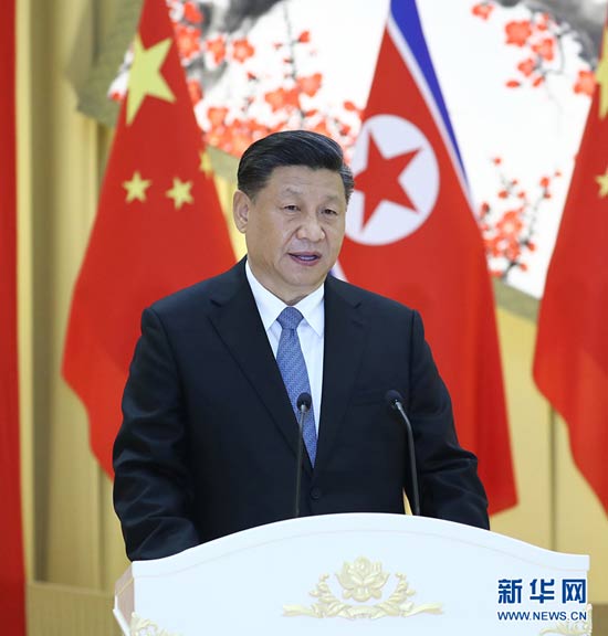 6月20日,中共中央總書記、國家主席習近平出席朝鮮勞動黨委員長、國務委員會委員長金正恩在平壤木蘭館舉行的歡迎宴會。這是習近平在宴會上致辭。 新華社記者 鞠鵬 攝