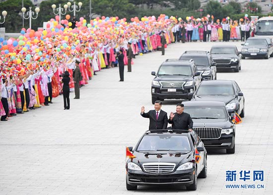 6月20日,中共中央總書(shū)記、國(guó)家主席習(xí)近平乘專機(jī)抵達(dá)平壤,開(kāi)始對(duì)朝鮮民主主義人民共和國(guó)進(jìn)行國(guó)事訪問(wèn)。朝鮮勞動(dòng)黨委員長(zhǎng)、國(guó)務(wù)委員會(huì)委員長(zhǎng)金正恩和夫人李雪主到機(jī)場(chǎng)熱情迎接習(xí)近平和夫人彭麗媛。朝方在機(jī)場(chǎng)舉行隆重歡迎儀式。歡迎儀式結(jié)束后,習(xí)近平與金正恩同車前往錦繡山太陽(yáng)宮廣場(chǎng),沿途數(shù)十萬(wàn)群眾夾道歡迎。 新華社記者 申宏 攝
