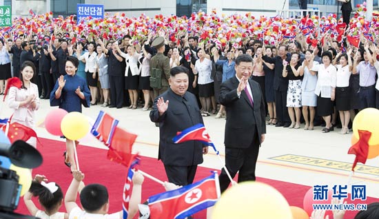 6月21日,中共中央總書記、國家主席習近平結(jié)束對朝鮮的國事訪問離開平壤回國。離開前,習近平和夫人彭麗媛出席朝鮮勞動黨委員長、國務委員會委員長金正恩和夫人李雪主在機場舉行的歡送儀式。新華社記者 黃敬文 攝