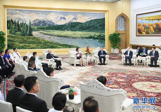6月28日,中共中央政治局常委、全國(guó)政協(xié)主席汪洋在北京會(huì)見(jiàn)臺(tái)灣兩岸和平發(fā)展論壇榮譽(yù)顧問(wèn)高金素梅率領(lǐng)的臺(tái)灣民意代表和少數(shù)民族參訪團(tuán)。新華社記者 申宏 攝
