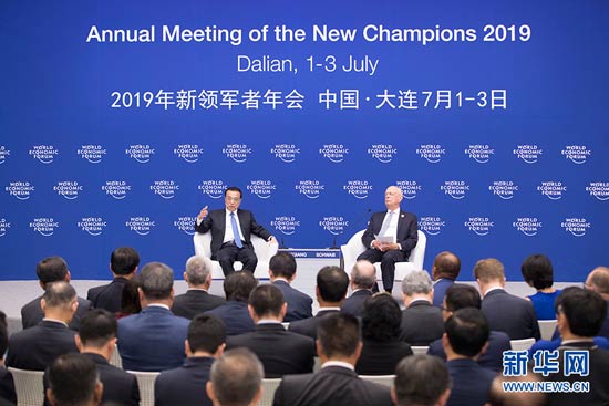 7月2日,國(guó)務(wù)院總理李克強(qiáng)在大連同出席2019年夏季達(dá)沃斯論壇的國(guó)際工商、金融、智庫(kù)、媒體界代表舉行對(duì)話會(huì)。 新華社記者 王曄
