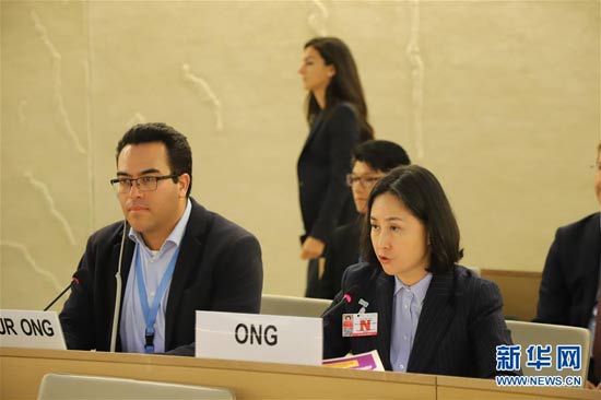 9月11日,在瑞士日內(nèi)瓦,中國(guó)香港各界婦女聯(lián)合協(xié)進(jìn)會(huì)主席何超瓊(前右)在聯(lián)合國(guó)人權(quán)理事會(huì)第42次會(huì)議期間發(fā)言。 繼當(dāng)天早些時(shí)候在聯(lián)合國(guó)人權(quán)理事會(huì)第42次會(huì)議一般性辯論環(huán)節(jié)發(fā)言后,何超瓊11日下午再次在“真相、正義、賠償與保證不再發(fā)生”議題下發(fā)言指出,部分自詡的香港“自由斗士”偽善且使用雙重標(biāo)準(zhǔn)。 新華社記者陳俊俠攝