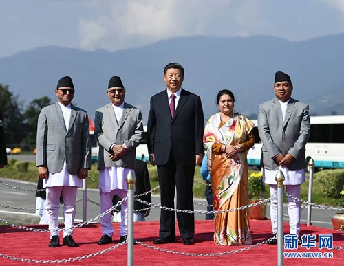 班達(dá)里在機(jī)場(chǎng)為習(xí)近平舉行隆重歡送儀式。尼泊爾副總統(tǒng)普恩、總理奧利、聯(lián)邦議會(huì)聯(lián)邦院主席蒂米爾西納、所有內(nèi)閣成員、軍方高級(jí)將領(lǐng)參加。