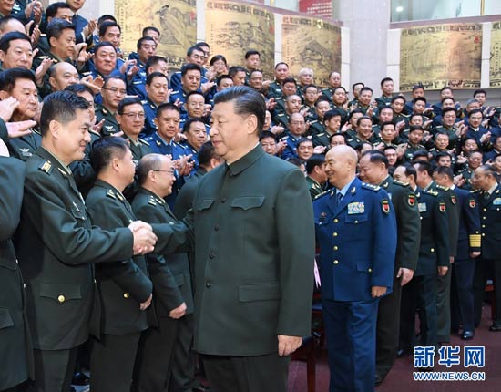 11月27日上午,全軍院校長集訓在國防大學開班。中共中央總書記、國家主席、中央軍委主席習近平出席開班式并發(fā)表重要講話,代表黨中央和中央軍委,向全軍院校長和軍事教育戰(zhàn)線的同志們致以誠摯問候。這是習近平親切接見集訓班全體學員。 新華社記者 李剛 攝