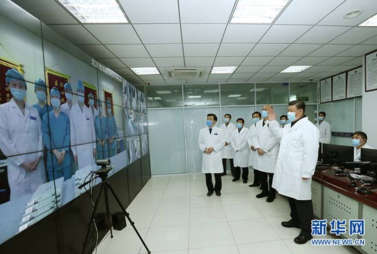 2月10日,中共中央總書記、國家主席、中央軍委主席習近平在北京調研指導新冠肺炎疫情防控工作。這是習近平在首都醫(yī)科大學附屬北京地壇醫(yī)院遠程診療中心,通過視頻連線武漢市收治新冠肺炎患者的金銀潭醫(yī)院、協(xié)和醫(yī)院、火神山醫(yī)院,了解情況、聽取意見和建議,慰問一線醫(yī)務工作者。 新華社記者 鞠鵬 攝