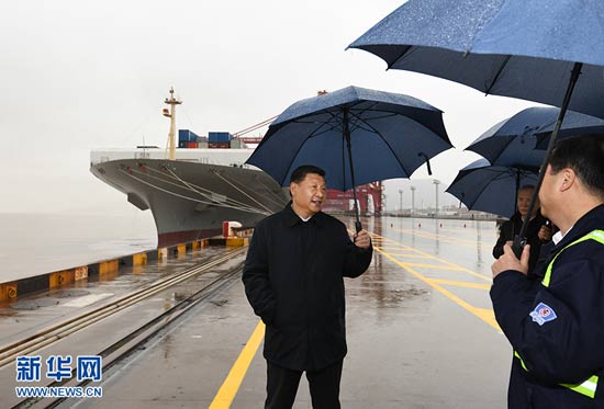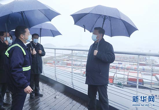 3月29日,中共中央總書記、國(guó)家主席、中央軍委主席習(xí)近平在浙江考察調(diào)研。這是習(xí)近平在寧波舟山港穿山港區(qū)碼頭了解港口復(fù)工復(fù)產(chǎn)情況。 新華社記者 申宏 攝