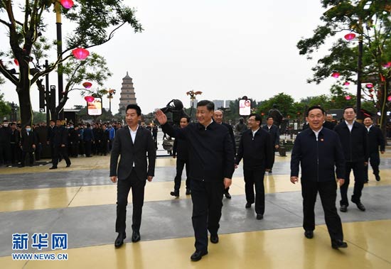 4月20日至23日,中共中央總書記、國家主席、中央軍委主席習(xí)近平在陜西考察。這是4月22日,習(xí)近平在西安大唐不夜城步行街考察時(shí),向游客揮手致意。 新華社記者 謝環(huán)馳 攝