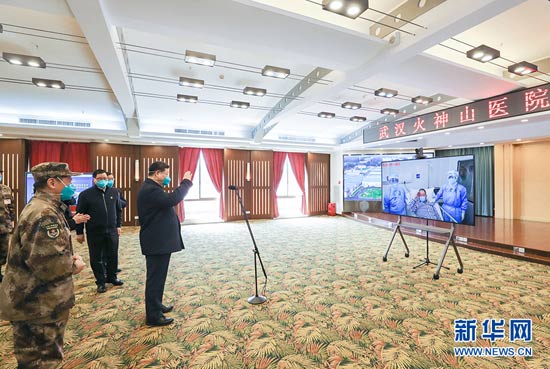 3月10日,習(xí)近平專門赴湖北省武漢市考察新冠肺炎疫情防控工作。這是習(xí)近平在火神山醫(yī)院指揮中心視頻連線感染科病房,與病房?jī)?nèi)患者和醫(yī)務(wù)人員親切交流。 新華社記者 鞠鵬 攝