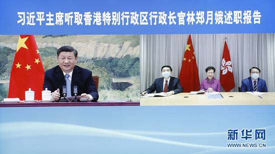 1月27日,國家主席習近平在北京以視頻連線方式聽取了香港特別行政區(qū)行政長官林鄭月娥2020年度的述職報告。新華社記者 劉彬 攝