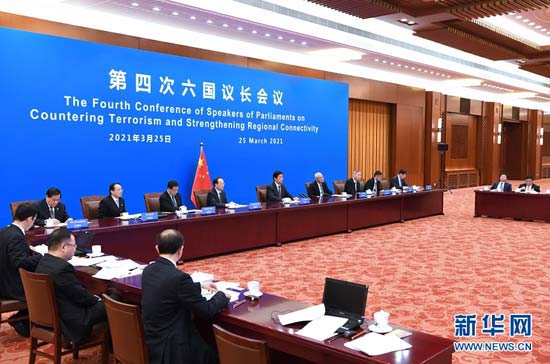 3月25日,全國人大常委會(huì)委員長栗戰(zhàn)書在北京人民大會(huì)堂以視頻方式出席第四次六國議長會(huì)議并發(fā)表講話。新華社記者 饒愛民 攝