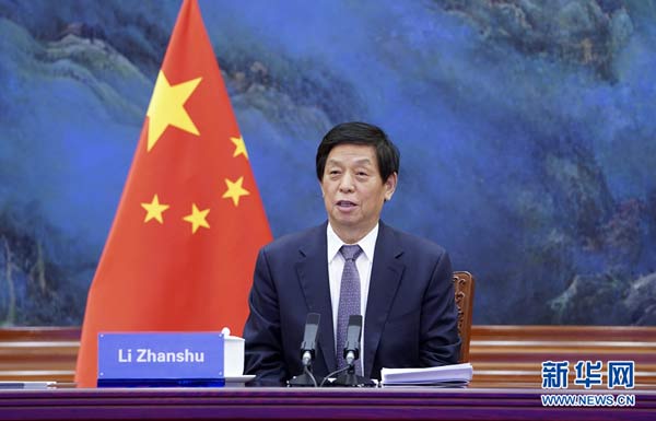 3月31日,全國人大常委會委員長栗戰(zhàn)書在北京人民大會堂以視頻方式同蒙古國國家大呼拉爾主席贊丹沙塔爾舉行會談。新華社記者 張領(lǐng) 攝