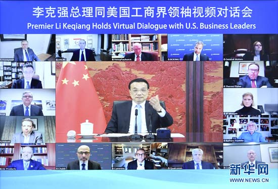 4月13日,國務(wù)院總理李克強(qiáng)在北京中南海紫光閣出席同美國工商界領(lǐng)袖視頻對(duì)話會(huì)。新華社記者 燕雁 攝