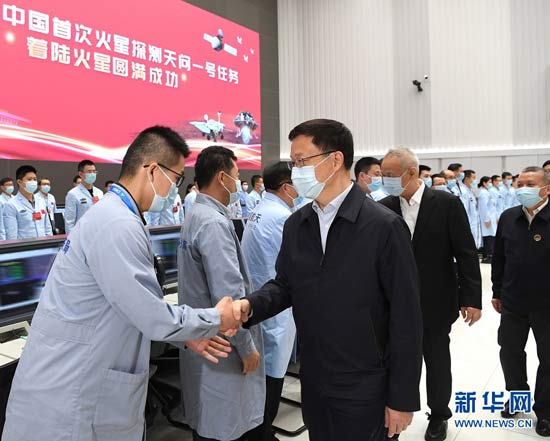 5月15日7時18分,天問一號探測器成功著陸于火星烏托邦平原南部預(yù)選著陸區(qū),我國首次火星探測任務(wù)著陸火星取得成功。中共中央政治局常委、國務(wù)院副總理韓正在北京航天飛行控制中心觀看天問一號探測器實(shí)施火星著陸情況。