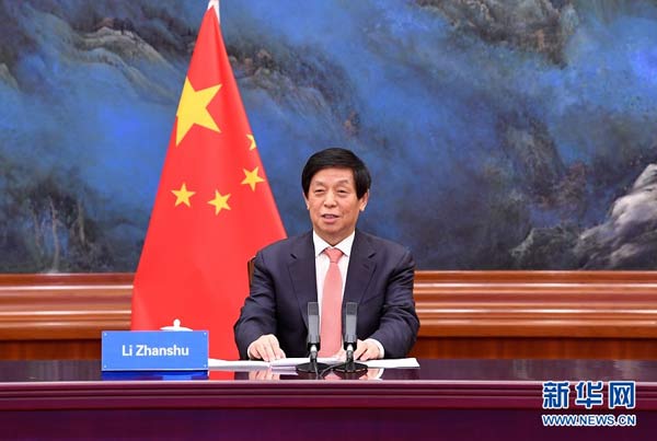 5月19日,全國人大常委會委員長栗戰(zhàn)書在北京人民大會堂以視頻方式同馬達(dá)加斯加國民議會議長克里斯蒂娜舉行會談。新華社記者 申宏 攝