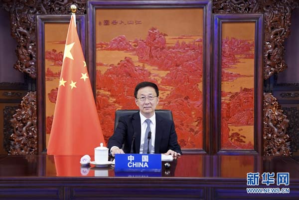 5月18日,中共中央政治局常委、國(guó)務(wù)院副總理韓正在北京以視頻方式出席非洲經(jīng)濟(jì)體融資峰會(huì)并致辭。新華社記者 張領(lǐng) 攝
