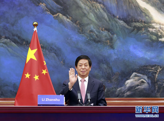 6月2日,全國(guó)人大常委會(huì)委員長(zhǎng)栗戰(zhàn)書(shū)在北京人民大會(huì)堂以視頻方式同所羅門(mén)群島國(guó)民議會(huì)議長(zhǎng)奧蒂舉行會(huì)談。新華社記者 丁林 攝