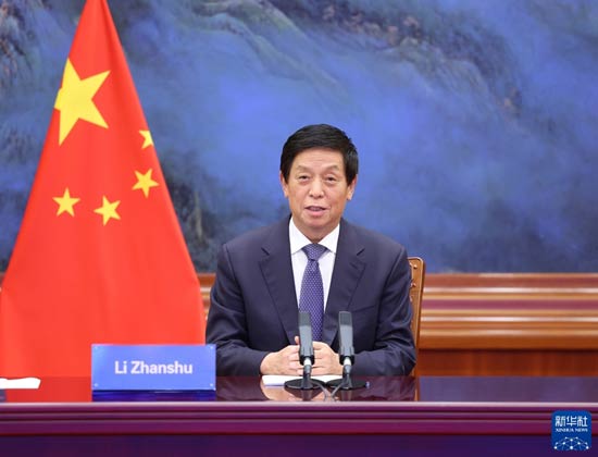 9月15日,全國(guó)人大常委會(huì)委員長(zhǎng)栗戰(zhàn)書在北京人民大會(huì)堂以視頻方式同巴林國(guó)民議會(huì)議長(zhǎng)兼眾議長(zhǎng)扎伊納勒舉行會(huì)談。