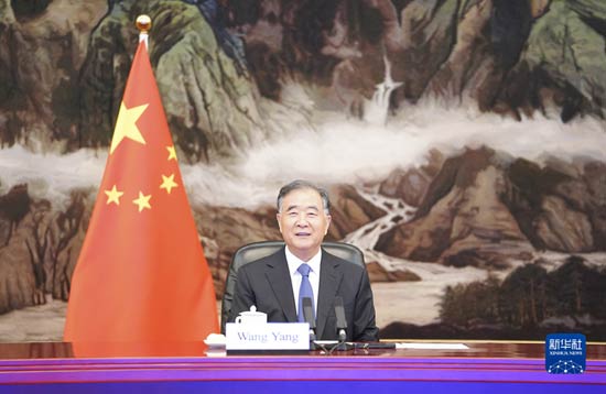 10月12日,全國政協(xié)主席汪洋在北京以視頻方式會見柬埔寨參議院主席賽沖。新華社記者 李響 攝