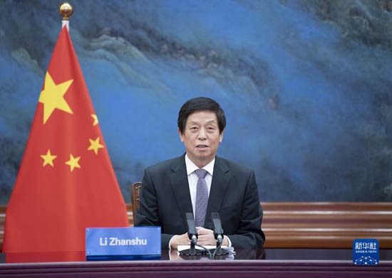 10月27日,全國人大常委會委員長栗戰(zhàn)書在北京人民大會堂以視頻方式同愛爾蘭眾議長奧法喬爾舉行會談。新華社記者 李濤 攝