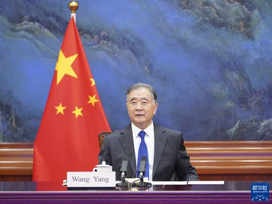 11月3日,全國政協(xié)主席汪洋在北京以視頻方式會見剛果(布)參議長恩戈洛。新華社記者 高潔 攝