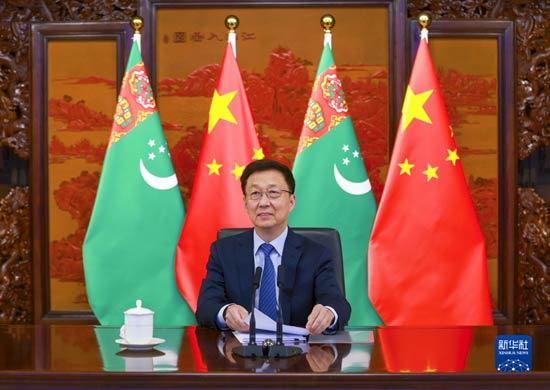 11月22日,中共中央政治局常委、國務(wù)院副總理、中土合作委員會中方主席韓正在北京以視頻方式同土庫曼斯坦副總理謝·別爾德穆哈梅多夫共同主持中土合作委員會第五次會議。新華社記者 丁林 攝