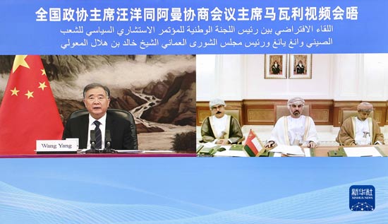 3月23日,全國政協(xié)主席汪洋在北京以視頻方式會(huì)見阿曼協(xié)商會(huì)議主席馬瓦利。新華社記者 劉衛(wèi)兵 攝