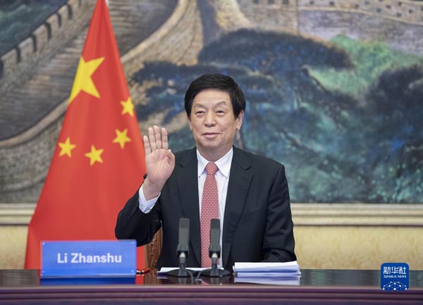 4月19日,全國(guó)人大常委會(huì)委員長(zhǎng)栗戰(zhàn)書在北京人民大會(huì)堂以視頻方式同墨西哥參議長(zhǎng)桑切斯舉行會(huì)談。