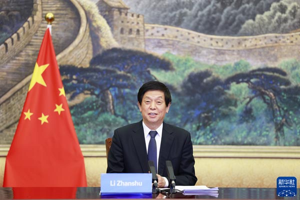 4月27日,全國人大常委會委員長栗戰(zhàn)書在北京人民大會堂以視頻方式同挪威議長加拉哈尼舉行會談。新華社記者 丁林 攝