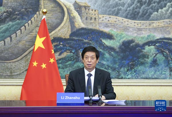 6月15日,全國人大常委會(huì)委員長栗戰(zhàn)書在北京人民大會(huì)堂以視頻方式同圭亞那議長納迪爾舉行會(huì)談。