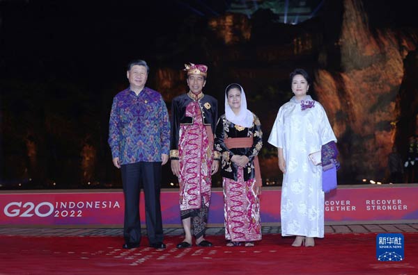 當?shù)貢r間11月15日晚,國家主席習近平和夫人彭麗媛在印度尼西亞巴厘島出席二十國集團領導人峰會歡迎晚宴。這是習近平主席夫婦在晚宴前同印度尼西亞總統(tǒng)佐科夫婦合影。新華社記者 鞠鵬 攝