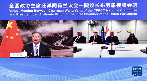 11月24日,全國(guó)政協(xié)主席汪洋在北京以視頻方式會(huì)見(jiàn)荷蘭議會(huì)一院議長(zhǎng)布勞恩。新華社記者 黃敬文 攝
