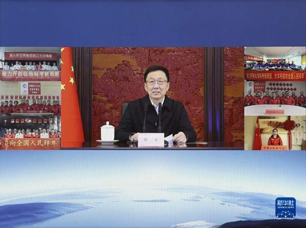 1月18日,國(guó)務(wù)院副總理韓正在北京通過(guò)衛(wèi)星視頻連線,向我國(guó)正在極地和大洋執(zhí)行任務(wù)的科學(xué)考察隊(duì)員們致以親切的慰問(wèn)和新春的祝福。