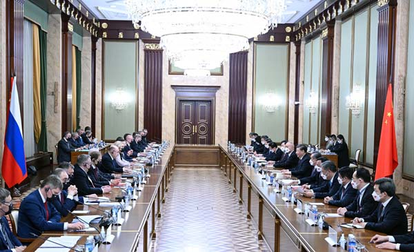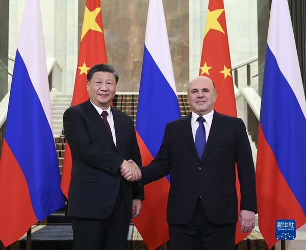 當(dāng)?shù)貢r間3月21日上午,國家主席習(xí)近平在俄羅斯聯(lián)邦政府大廈會見俄羅斯總理米舒斯京。新華社記者 丁海濤 攝