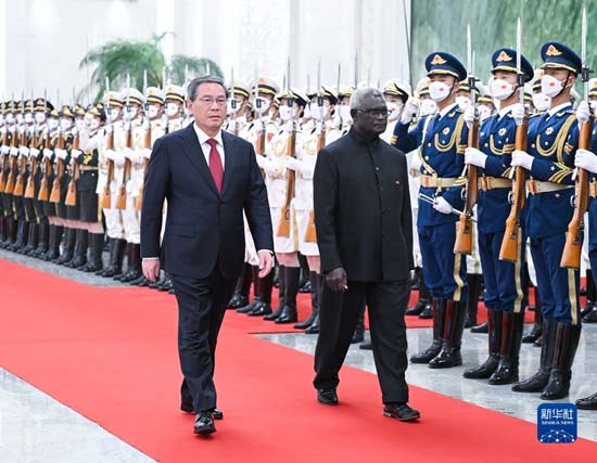 7月10日上午,國務(wù)院總理李強(qiáng)在北京人民大會(huì)堂同來華進(jìn)行正式訪問的所羅門群島總理索加瓦雷會(huì)談。這是會(huì)談前,李強(qiáng)在人民大會(huì)堂北大廳為索加瓦雷舉行歡迎儀式。新華社記者 岳月偉 攝