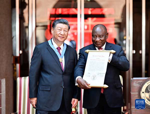 當?shù)貢r間8月22日上午,正在南非進行國事訪問的國家主席習近平在比勒陀利亞總統(tǒng)府同南非總統(tǒng)拉馬福薩會談。會談后,拉馬福薩向習近平授予“南非勛章”,這是南非授予重要友好國家元首的最高級別勛章和最高榮譽。