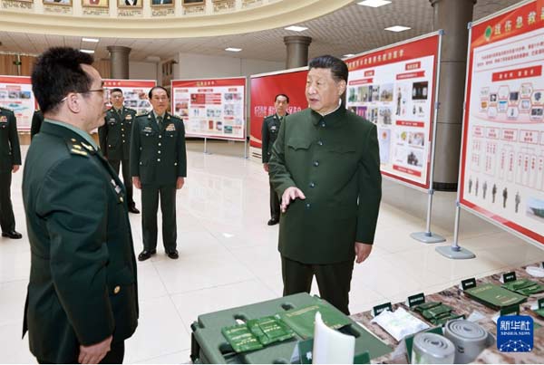 4月23日,中共中央總書記、國家主席、中央軍委主席習近平到陸軍軍醫(yī)大學視察。這是習近平察看戰(zhàn)傷急救器材和學員操作演示。